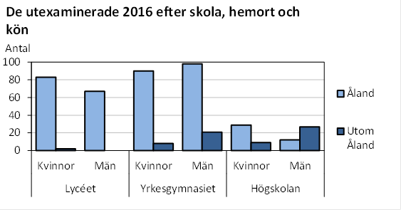 Vid såväl Yrkesgymnasiet som Högskolan var männen i majoritet bland de personer med hemort utanför Åland som tog examen. Yrkesgymnasiets utexaminerade ålänningar hade en relativt jämn könsfördelning med 52 procent män. Av de personer med hemort på Åland som slutförde sin utbildning vid Högskolan var drygt 70 procent kvinnor.