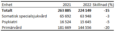 Cirka 64 000 besök gjordes vid den somatiska specialsjukvårdens kliniker, en minskning med 1 700 besök, eller tre procent, jämfört med året innan. Psykiatriska kliniken fick under 2022 omkring 15 600 besök, en minskning med fem procent.