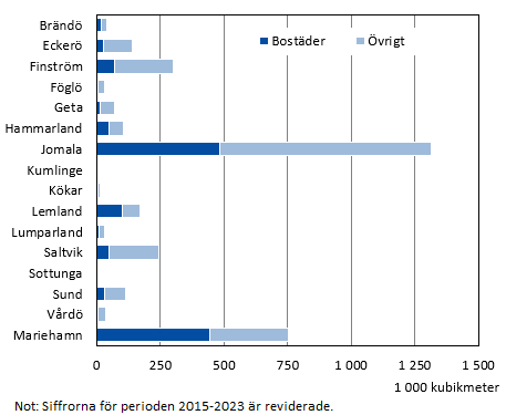 Den totala byggnadsvolymen som färdigställdes var 142 000 kubikmeter, vilket är betydligt mindre än medeltalet för perioden 2010–2023 som är 230 000 kubikmeter. Bostads- och fritidshus utgjorde hälften av volymen, medan en tredjedel var affärs- och kontorsbyggnader. Byggandet i Mariehamn stod för närmare 40 procent av volymen och nästan lika stor andel byggdes i Jomala.