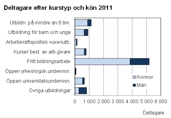 Trots att antalet kvinnliga deltagare minskat och de manliga blivit flera jämfört med 2010 utgjorde kvinnorna drygt 70 procent av deltagarna i utbildning som inte leder till examen 2011. Störst var kvinnodominansen inom kurser som beställts av arbetsgivare och öppen universitetsutbildning, där kvinnorna stod för över 80 procent av deltagarna. Utbildningen inom fritt bildningsarbete hade en något jämnare könsfördelning än föregående år, men kvinnorna var ändå i majoritet med nästan tre fjärdedelar av deltagarna. Fler män än kvinnor deltog i öppen yrkeshögskoleundervisning och övriga utbildningar.