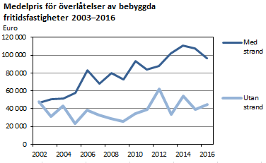 För obebyggda stugtomter vid strand var det genomsnittliga kvadratmeterpriset sju euro 2016, vilket också det är en minskning från 2015. Priset har vanligen rört sig mellan tre och sex euro under 2000-talet. För tomter utan strand var kvadratmeterpriset nästan lika högt 2016 eller närmare sju euro, vilket är en hög notering jämfört med 2000-talet i stort då det vanligen har varierat mellan en och fyra euro.
