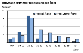 Också utflyttningen är i hög grad koncentrerad till yngre åldersgrupper. Över 40 procent är mellan 20 och 30, och drygt 20 procent är yngre än så. De som är födda på Åland flyttar främst ut i yngre år. Bland utflyttarna under 30 år utgör de drygt hälften, medan utflyttningen högre upp i åldrarna domineras av personer som någon gång tidigare har flyttat in.