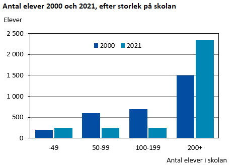 Höstterminen 2021 gick över 230 barn i skolor med 50–99 elever. Barn som läser på skolor i denna storleksklass har minskat drastiskt sedan år 2000, då antalet var nästan 600. Antal barn i skolor med över 200 elever har i stället ökat kraftigt under samma period. Något som tydligt påverkat dessa siffror var en serie sammanslagningar av grundskolor under 2000-talets första decennium.