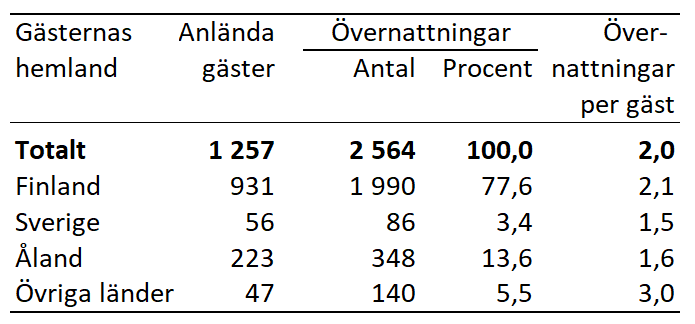 Det anlände nästan 1 300 gäster till hotellen i april 2021, vilket kan jämföras med ett medeltal på över 6 000 gäster i april månad under 2000–2019. Tre fjärdedelar av gästerna i april 2021 kom från Finland och närmare en femtedel var ålänningar. Från Sverige kom färre än 60 personer. Jämförelsevis var genomsnittsantalet svenska hotellgäster i april under de två första decennierna av 2000-talet nästan 3 300 personer. Från övriga länder kom knappt 50 gäster, bland annat från Turkiet, Estland och Spanien. Gästerna stannade i medeltal två nätter per person.