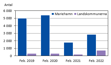 Det anlände 1 900 gäster till hotellen och närmare 60 procent av dem var finländare och 30 procent svenskar. Nästan 150 ålänningar övernattade på hotellen i februari och 85 personer kom från övriga länder, däribland Estland och Tyskland som representerades av ungefär 40 respektive 10 personer. Totalt kom det gäster från 19 olika länder. Finländare stod för drygt hälften av de 3 600 övernattningarna, Sverige för en knapp fjärdedel och övriga länder (exklusive Åland) för en femtedel. Jämfört med februari 2021 fyrdubblades de svenska gästernas övernattningar och de finländska ökade med 38 procent, medan ålänningarnas hotellövernattningar halverades. Övernattningarna av gäster från övriga länder var rekordstort för februari, över 700 stycken, vilket kan jämföras med en medelnivå på drygt 200 övernattningar i februari under 2000-talet (före pandemin). Det höga antalet övernattningar av gäster från övriga länder berodde till största del på arbetsresor, vilka stod för nästan 500 av de 700 övernattningarna.