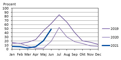 Beläggningsgraden av den totala rumskapaciteten nådde nästan 50 procent, vilket var betydligt högre än i juni 2020, men inte riktigt på samma nivå som i juni 2019 då den uppgick till ungefär 60 procent. I Mariehamn var drygt hälften av rummen belagda, medan under två femtedelar av rummen på hotellen i landskommunerna nyttjades.