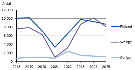 Sverige stod för drygt hälften av hotellövernattningarna i mars, och Finland för två femtedelar. Sedan pandemin har de svenska övernattningarna varit flera än de finländska endast två månader tidigare, i januari och februari 2024. Trots att de svenska övernattningarna nu var fler än de finländska hade de minskat med 11 procent från mars 2024. Nedgången i antalet finländska övernattningar var betydligt större, 34 procent.