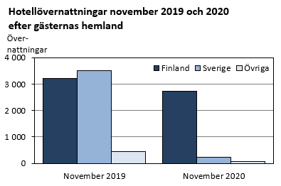 Knappt 3 100 övernattningar noterades på de åländska hotellen i november, vilket innebär en minskning med 57 procent jämfört med samma månad i fjol. Finländarnas övernattningar gick ned med 15 procent, medan övernattningar av personer från Sverige och övriga länder (exklusive Åland) minskade med 93–95 procent. De åländska övernattningarna ökade däremot, från 24 stycken i november 2019 till 65 i år. Hotellen i Mariehamn stod för nästan 96 procent av alla övernattningar denna månad.