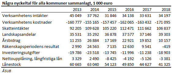 Kommunernas samlade årsbidrag för verksamhetsåret 2018 minskade med 9,7 miljoner jämfört med 2017 och blev 10,2 miljoner euro. Räkenskapsperiodens resultat minskade från 9,5 miljoner 2017 till -0,4 miljoner euro år 2018. Kommunernas investeringar ökade med 7,7 miljoner och var således 18,9 miljoner euro. Alla kommuner utom Sottunga gjorde investeringar. Tabellen nedan visar några nyckeltal för alla kommuner sammanlagt de senaste sju åren.