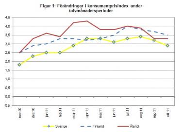 I oktober steg de åländska konsumentpriserna på årsbasis med 3,3 procent, oförändrat jämfört med september. I oktober inverkade högre priser inom huvudgruppen "bostäder, vatten, elektricitet, gas och övriga bränslen" mest på den totala uppgången (med 1,6 procentenheter), medan lägre priser inom huvudgrupperna "kläder och skodon", "kommunikationer" samt "rekreation och kultur" dämpade inflationen mest (med 0,1 procentenheter vardera). Från september till oktober steg konsumentpriserna i genomsnitt med 0,1 procent.