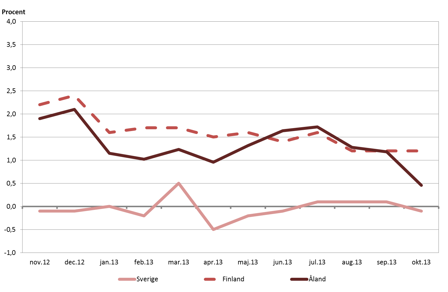 De åländska konsumentpriserna steg med 0,5 procent i oktober 2013 jämfört med oktober 2012, i september var ökningstakten 1,2 procent. I oktober inverkade högre priser inom huvudgrupperna "livsmedel och alkoholfria drycker" samt "hälsovård" mest på den totala uppgången (med 0,3 procentenheter vardera), medan lägre priser inom huvudgruppen "transport" dämpade inflationen mest (med 0,2 procentenheter). Från september till oktober sjönk konsumentpriserna i genomsnitt med 0,3 procent.
