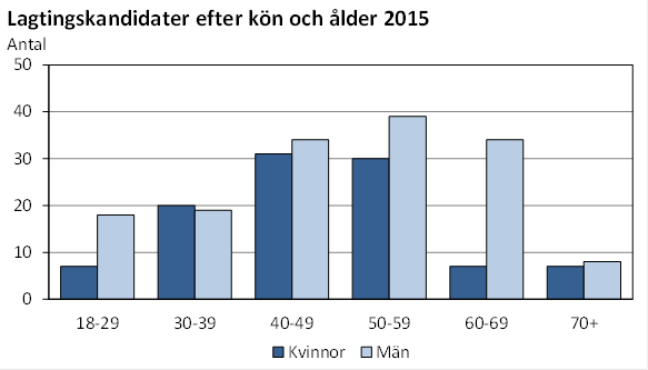 Antalet kandidater i årets lagtingsval är 254, vilket är den näst högsta siffran genom tiderna och sju färre än 2011. Kvinnorna är 102, vilket är 4 flera än förra valet, medan männen är 152, en minskning med 11. Kvinnornas andel är 40 procent och männens 60. Endast vid valen 1995 och 2003 har könsfördelningen varit något jämnare än nu. Ännu i slutet av 1960-talet var bara var tionde lagtingskandidat kvinna. Under 1970-talet steg andelen till drygt var fjärde och låg i den storleksordningen in på 1990-talet. Vid valet 1995 ökade andelen kvinnor till drygt 40 procent och kring den nivån har den rört sig sedan dess.