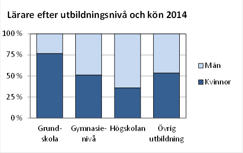 En stor majoritet eller två tredjedelar av lärarna är kvinnor. Kvinnorna överväger stort i grundskolan, men könsfördelningen har blivit något jämnare sedan 2011. På gymnasienivå och inom övrig utbildning är kvinnorna och männen ungefär lika många, medan männen är i majoritet vid Högskolan.