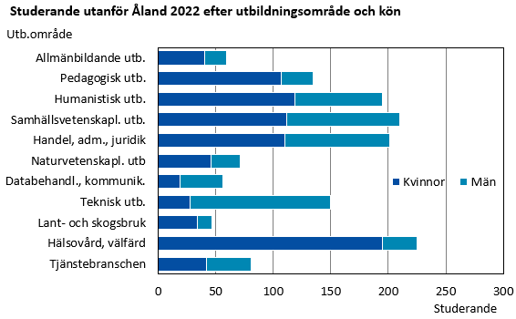 Det utbildningsområde som lockade flest personer till studier utanför Åland var hälsovård och välfärd. Drygt 15 procent av alla studerande läste en utbildning inom detta område och av dessa var nästan alla kvinnor. Därefter var det samhällsvetenskapliga och det humanistiska området samt handel, administration och juridik mest populära. Var och en av dessa områden hade en andel på runt 14 procent av de studerande och inom alla tre var kvinnorna något fler än männen. Inom databehandling och kommunikation samt det tekniska området var 66 respektive 81 procent män och dessa var samtidigt de enda områden där majoriteten var män.