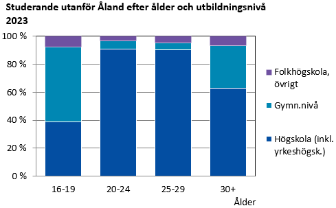 Antalet ålänningar som studerade utanför Åland uppgick till 1 453 under 2023, vilket var något fler än året innan (1 430 år 2022) och en fortsättning på en ökning som pågått sedan 2019. Strax över hälften av de studerande utanför Åland 2023 läste i Sverige och två femtedelar i Finland. Drygt 80 procent gick på universitet, högskola eller yrkeshögskola och flest utbildade sig inom området hälsovård och välfärd. Med en andel på 60 procent utgjorde kvinnorna en majoritet av alla som studerade utanför Åland. Hälften av de studerande var mellan 20 och 24 år.