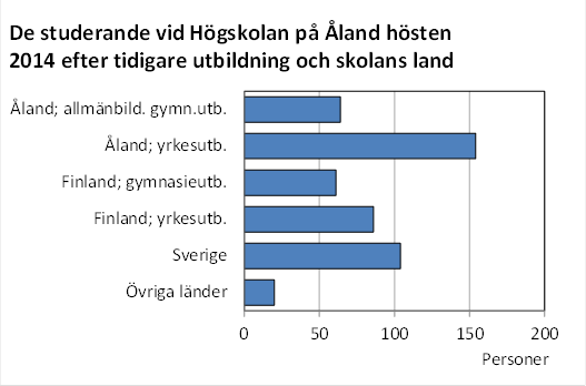 Lycéet har endast enstaka studerande med hemort utanför Åland, medan Yrkesgymnasiet har 75 stycken, eller 11 procent. Nästan alla kommer från Finland och över hälften går ett sjöfartsprogram. Flest icke-ålänningar på gymnasienivå har kockprogrammet, 16 personer. På Högskolan kommer 45 procent av de studerande utifrån och ungefär lika många är från Finland som från Sverige. Det är främst servicebranscherna som lockar studerande till Åland, vilket illustreras av diagrammet nedan.