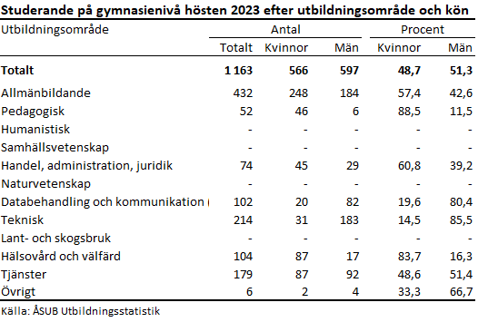 Antalet studerande på Ålands yrkesgymnasium uppgår till 731 studerande hösten 2023, en ökning i jämförelse med föregående höst då antalet var 713 . Männen utgör 57 procent av de studerande på Yrkesgymnasiet. I jämförelse med hösten 2022 sjönk antalet studerande på Ålands lyceum med 8 personer till 432 hösten 2023. Könsfördelningen på Ålands lyceum är i princip den motsatta om man jämför med Yrkesgymnasiet, där utgör kvinnorna i stället 57 procent av de studerande. Hösten 2023 har Högskolan på Åland 445 studerande, vilket är 28 färre än förra året och lägst sedan 2010. Andelen manliga studerande vid Högskolan uppgår till drygt 55 procent. Folkhögskolan har 38 studerande hösten 2022, 14 fler än året innan. Drygt 65 procent av de studerande på Folkhögskolan är kvinnor.
