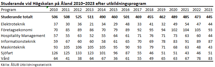 Hösten 2023 har Högskolan på Åland 445 studerande, vilket är 28 färre än förra året och lägst sedan 2010. Likt förra året återfinns flest studerande vid Högskolan på Åland inom företagsekonomiprogrammet. Antalet studerande är lägst på utbildningen till maskinteknik.