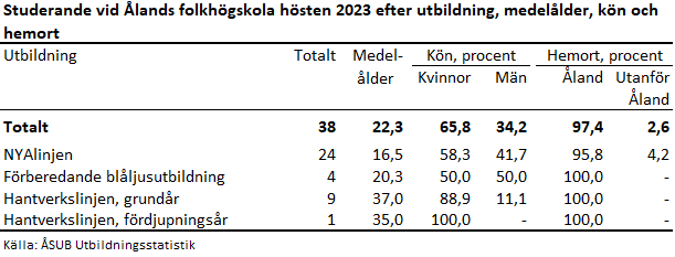 Folkhögskolan har 38 studerande hösten 2023, 14 fler än året innan. Drygt 65 procent av de studerande är kvinnor och nästan alla kommer från Åland.