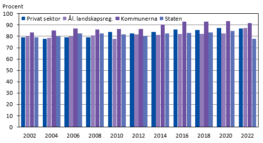Kvinnors medelmånadslön i relation till mäns 2002-2022, total månadsinkomst, heltidsanställda, procent