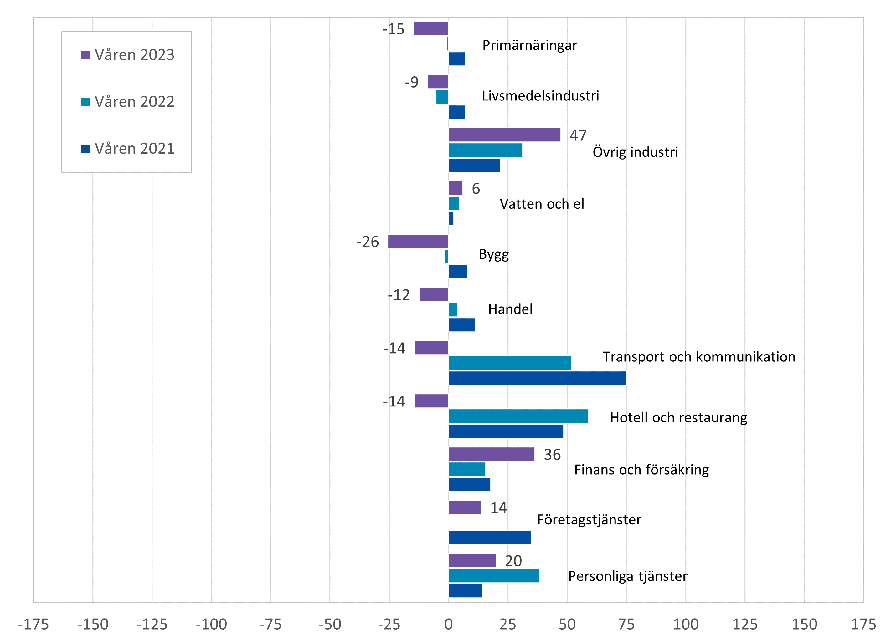 Tillväxtförväntningarna på personalstyrkan inom den privata sektorn är totalt sett positiv tolv månader fram, men förväntningarna är splittrade mellan branscherna. Hälften av branscherna har positiva förväntningar, medan andra hälften har negativa förväntningar. De branscher som förväntar sig mest positiv utveckling är branscherna övrig industri samt finans och försäkring, medan en viss positiv utveckling även kan ses inom personliga tjänster, företagstjänster samt vatten och el. Byggbranschen är den bransch som har den mest negativa utsikten, följt av primärnäringarna, transport och kommunikation, hotell- och restaurang, handeln samt livsmedelsindustrin. Det kan finnas många orsaker till den förväntade utvecklingen i de olika branscherna, men övergripande kan nämnas att rådande konjunkturläge med hög inflation, konsumenternas svagare köpkraft, ökade materialkostnader etc. påverkar olika branscher olika hårt.