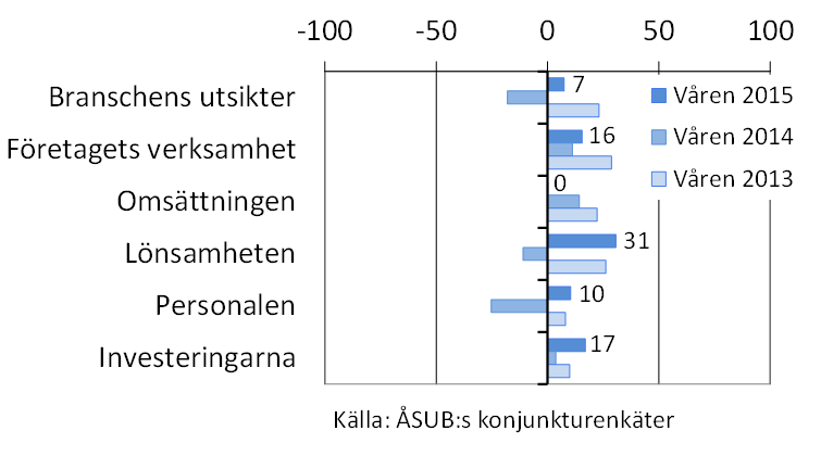 • Från det privata åländska näringslivet hörs försiktigt positiva signaler, enligt ÅSUBs konjunkturbarometer. Trots det räknar vi med att ekonomin som helhet, de privata och offentliga sektorerna tillsammans, inte ännu kommer att ta sig ur den långvariga tillväxtsvackan under detta år.